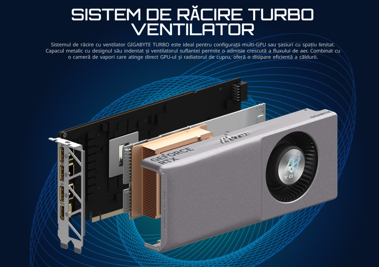 Camera de vapori și radiatorul de cupru au avantajul unei conductivități termice ridicate, transferând și disipând eficient căldura generată de GPU. Cadrul metalic disipează și mai mult căldura de la alte componente critice, îmbunătățind eficiența generală a răcirii.