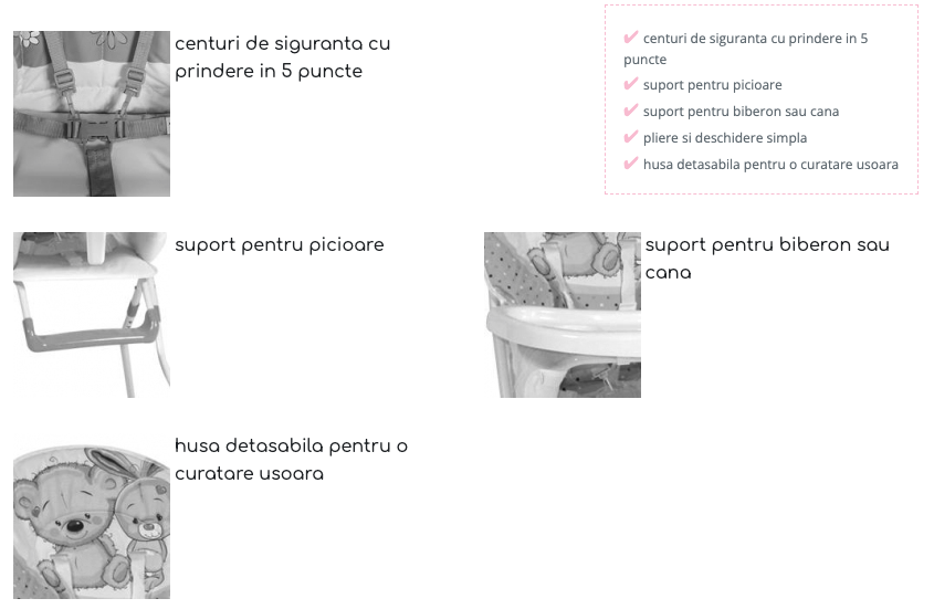 ♦ tavita/ masuta detasabila, ce permite pozitionarea bebelusului la masa.
