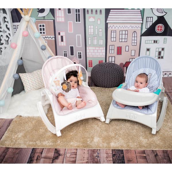 Fotoliul balansoar cu masuta, vibratii si muzica Alex este conceput pentru odihna, joaca si servit masa. Sezutul si spatarul confortabile si reglabile, impreuna cu bara cu jucarii tentante si tavita pentru servit masa sau joaca, asigura odihna si relaxarea bebelusului, oferind astfel timp liber parintilor.