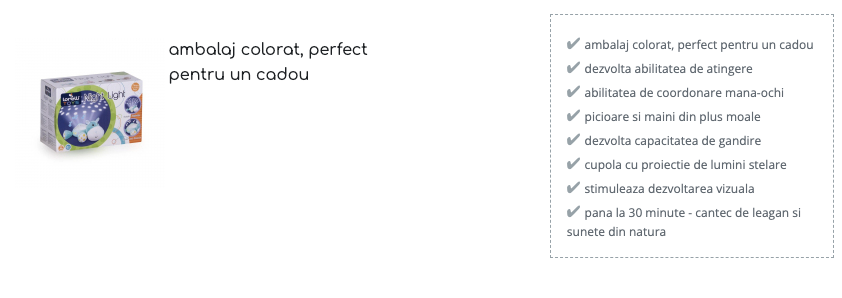 ♦ proiector cu lumina colorata, cu muzica frumoasa si sunete din natura pentru a asigura bebelusului un somn linistitor.