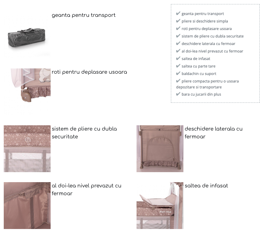 ♦ partile laterale ale patutului sunt confectionate din material transparent, care permite supravegherea bebelusului.