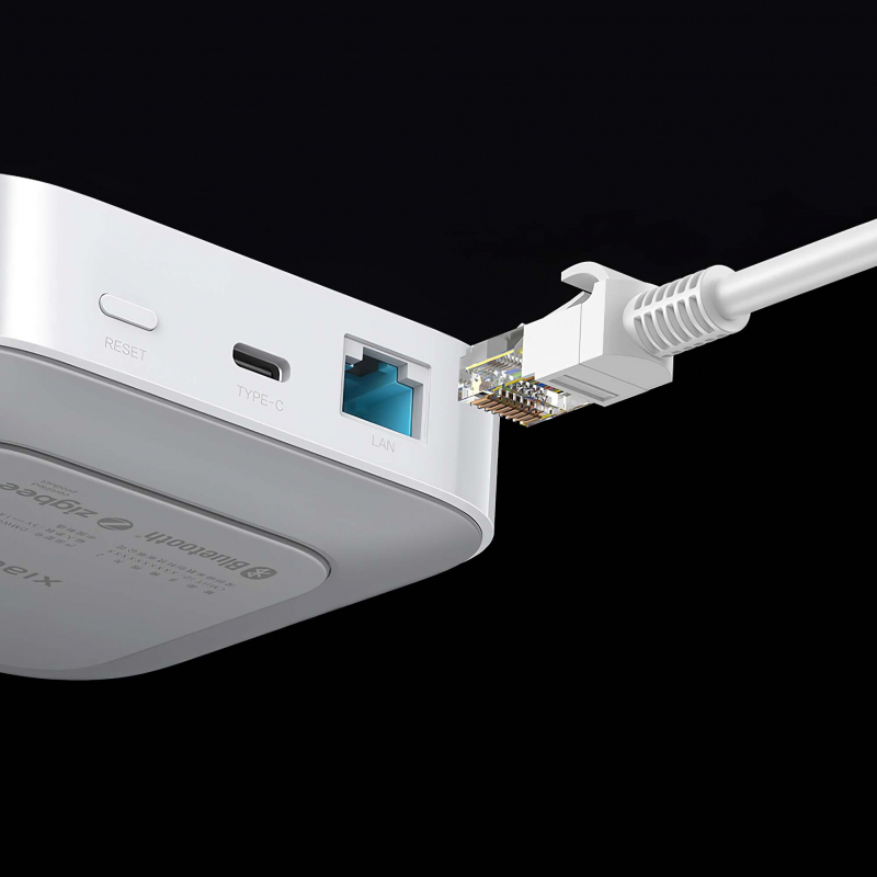 Xiaomi Smart Home Hub 2 suporta conexiune la internet prin cablu, datorita portului RJ45.