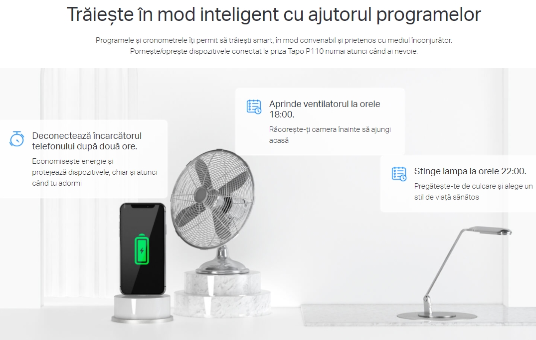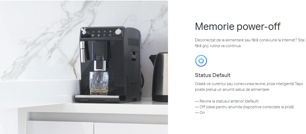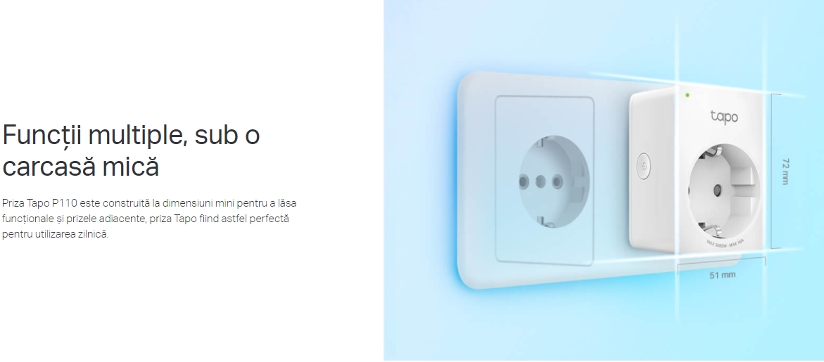 - Monitorizarea consumului de energie - Monitorizează consumul de energie în timp real, prin intermediul aplicației TP-Link Tapo. Economisește bani și energie în mod inteligent, administrând aparatele și dispozitivele conectate la priză, după cum ai nevoie