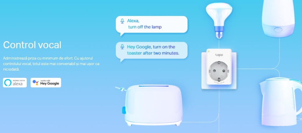- Control Vocal – Administrează priza inteligentă cu ajutorul comenzilor vocale, utilizând Amazon Alexa sau Google Assistant