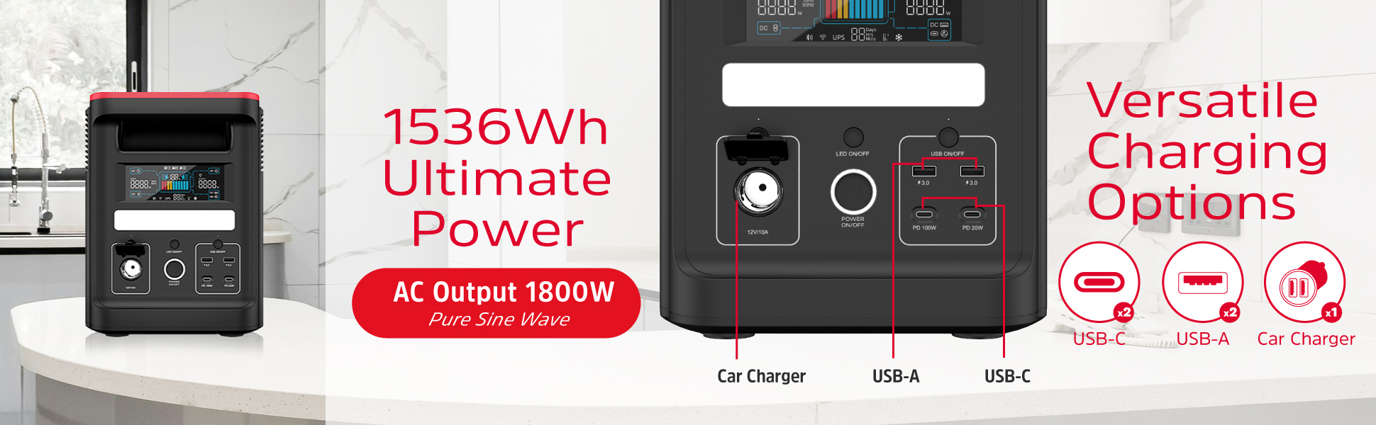 - Porturi de iesire multiple: USB-A, USB-C dublu, priza auto si AC