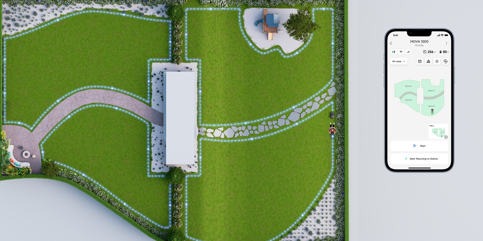 Configurați cu ușurință mai multe zone de cosit folosind aplicația. Personalizați direcțiile de cosit și eficiența cosirii pentru fiecare zonă. Mova 1000/600 va naviga automat între aceste zone, terminând lucrarea fără probleme și eficient.