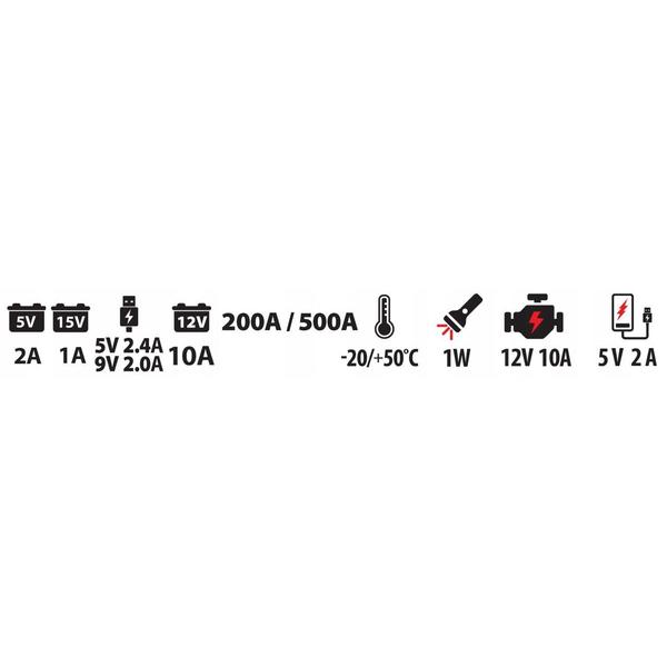 - Tensiune si curent de iesire: incarcare rapida, 5 [V] 2,4 [A], 9 [V] 2,0 [A], 12 [V] Jump Starter 10 [A]