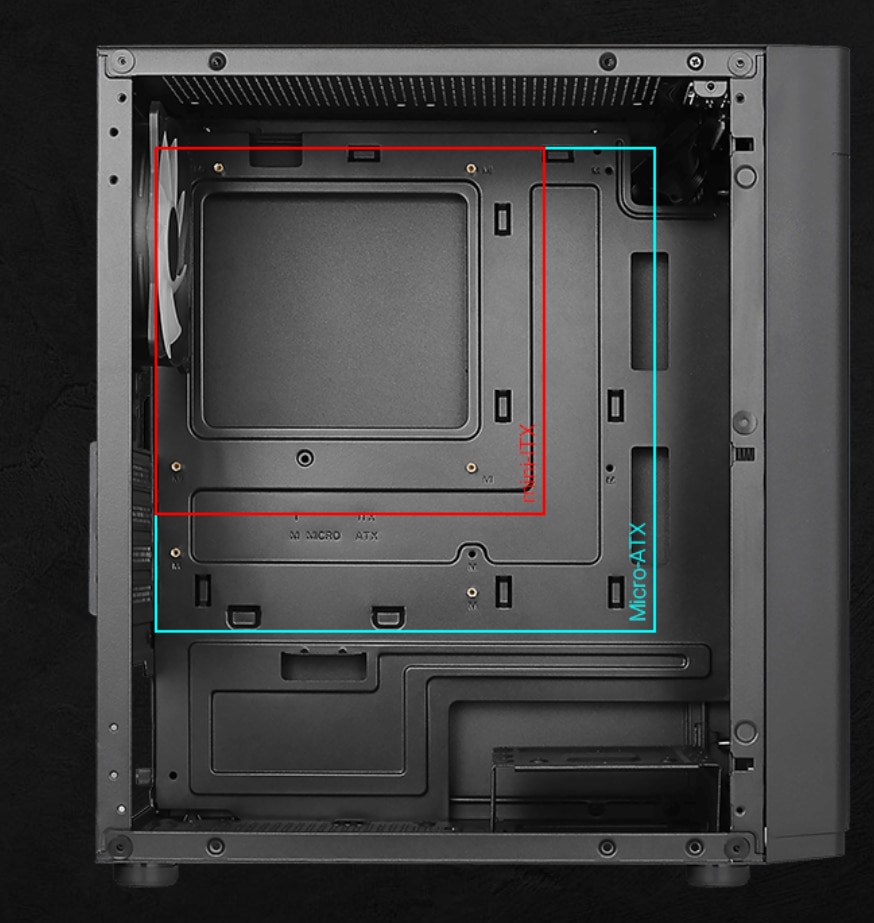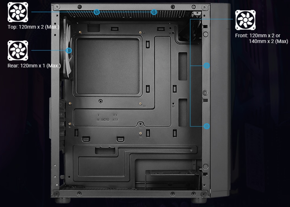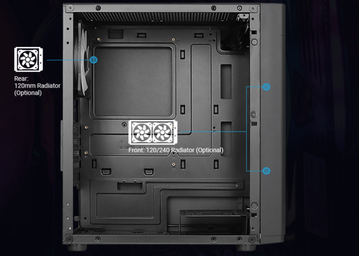 RACIREA LICHIDA Suporta racirea cu lichid in partea din fata si din spate a carcasei pentru o eficienta maxima a racirii. Fata: radiator de 120/240 mm (optional) Spate: Radiator de 120 mm (optional) (nu este compatibil cu racitorul cu pompa pe radiator) |