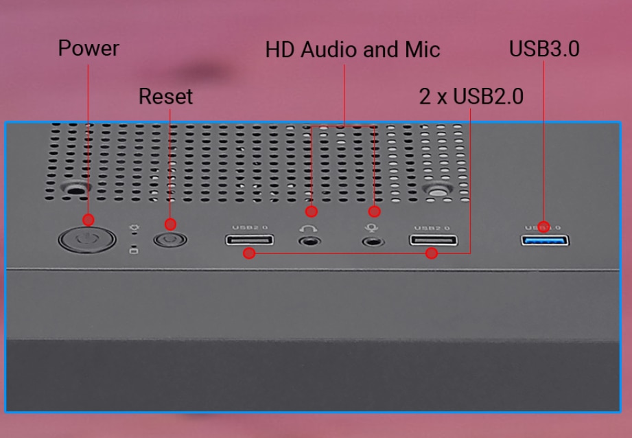 ACCES CONVENABIL LA MEDIILE DVS. Acces rapid si usor la porturile USB 3.0 x 1, USB 2.0 x 2, USB 2.0 x 2, porturile audio HD si microfon, precum si la butonul de alimentare si resetare. |