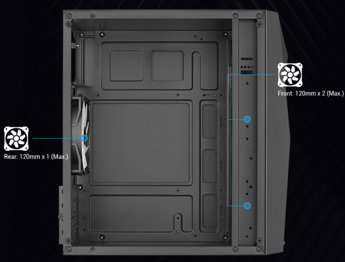 RACIRE AER Suporta racirea cu aer in partea din fata si din spate a carcasei pentru a imbunatati performanta de racire. Fata: 120 mm x 2 (max.) In spate: 120 mm x 1 (max.) |