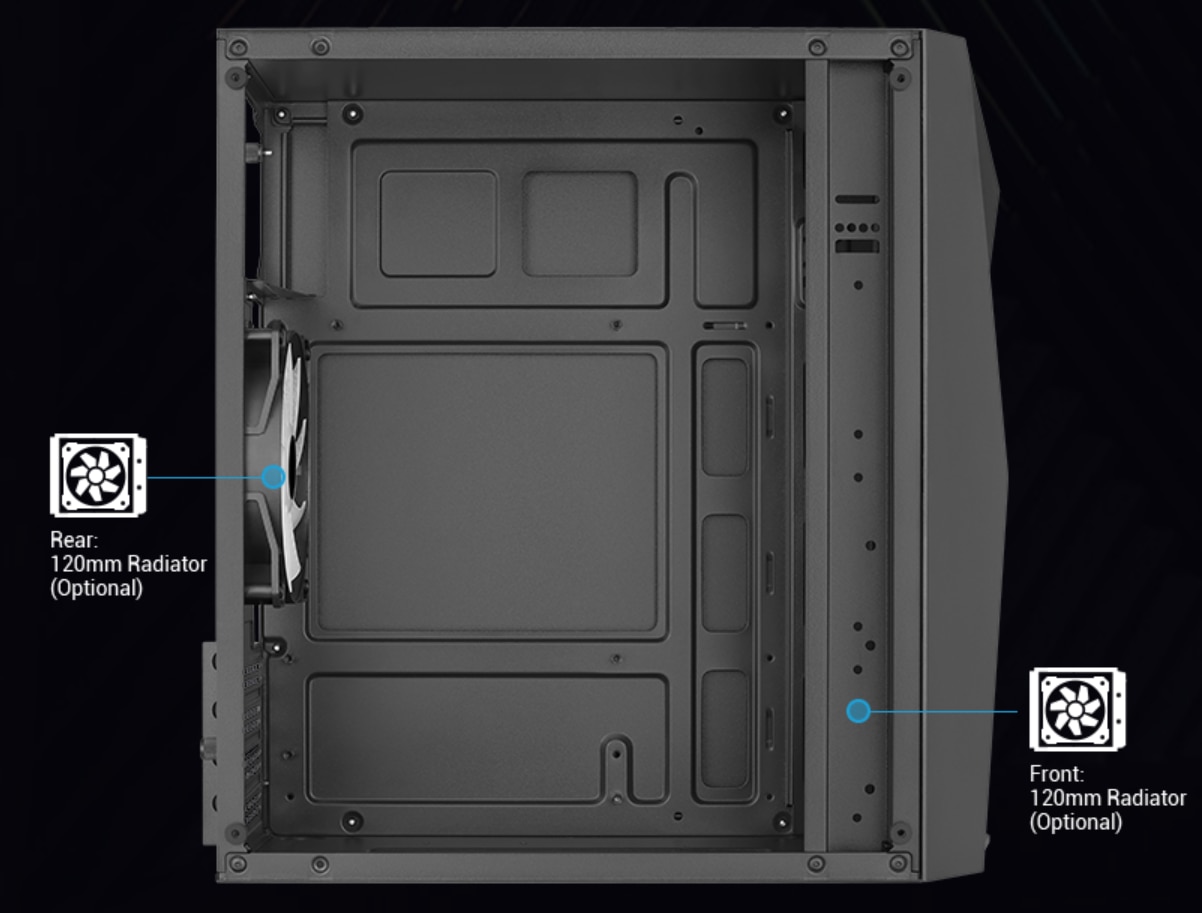 RACIREA LICHIDA Suporta racirea cu lichid in partea din fata si din spate a carcasei pentru o eficienta maxima a racirii. Fata: radiator de 120 mm (optional) In spate: radiator de 120 mm (optional) (lungimea radiatorului <154 mm) |