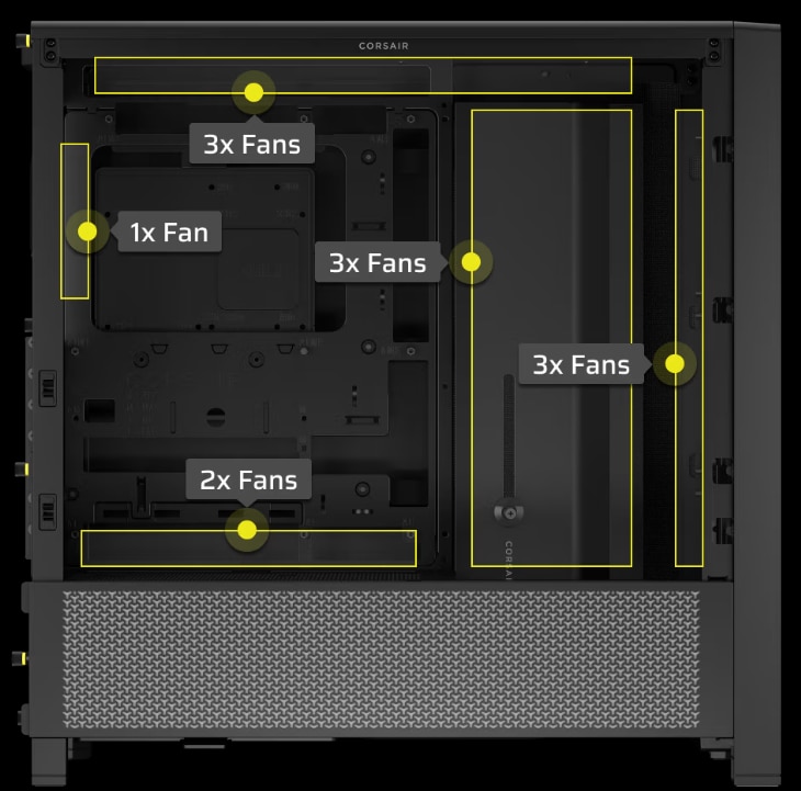 | Ventilatoare optionale | Tavan: 3x 120 mm sau 2x 140 mm Podea: 2x 120 mm Lateral: 3x 120 mm sau 2x 140 mm Spate: 1x 120 mm sau 1x 140 mm |