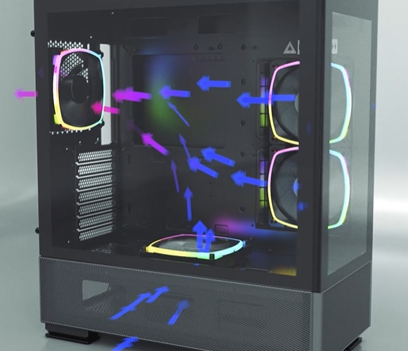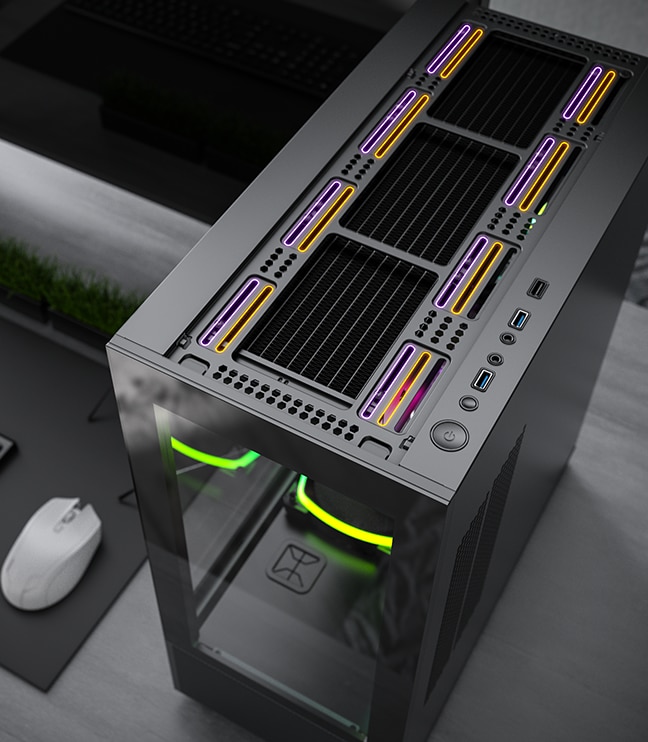 Bucurati-va de vederile neobstructionate Datorita panoului frontal si lateral integrat, utilizatorii isi pot vedea intregul interior la prima vedere. Plasa fina care acopera din partea inferioara a panoului frontal se extinde pana la camera PSU cu ventilatoare ARGB preinstalate care sporesc frumusetea acestei capodopere. |