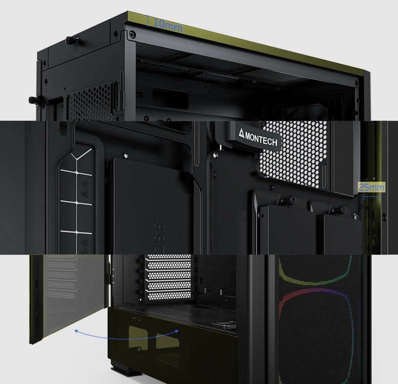 ▶ 10mm inaltime adaugata in partea de sus pentru a sustine grosimea radiatorului de 66mm. ▶ 5mm spatiu amplificat pentru gestionarea cablurilor, spatiul de gestionare a cablurilor SKY TWO GX este acum de 25mm! ▶ Panou de sticla cu deschidere a usii, suruburi cu degete pentru sloturile PCIe si un design usor de indepartat pentru panoul de plasa lateral inferior. |
