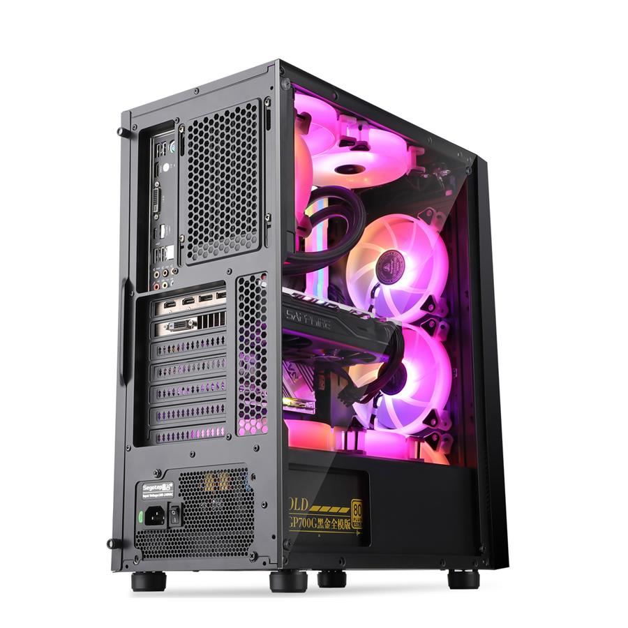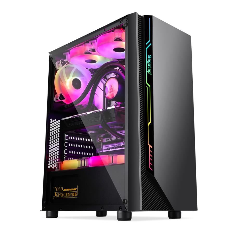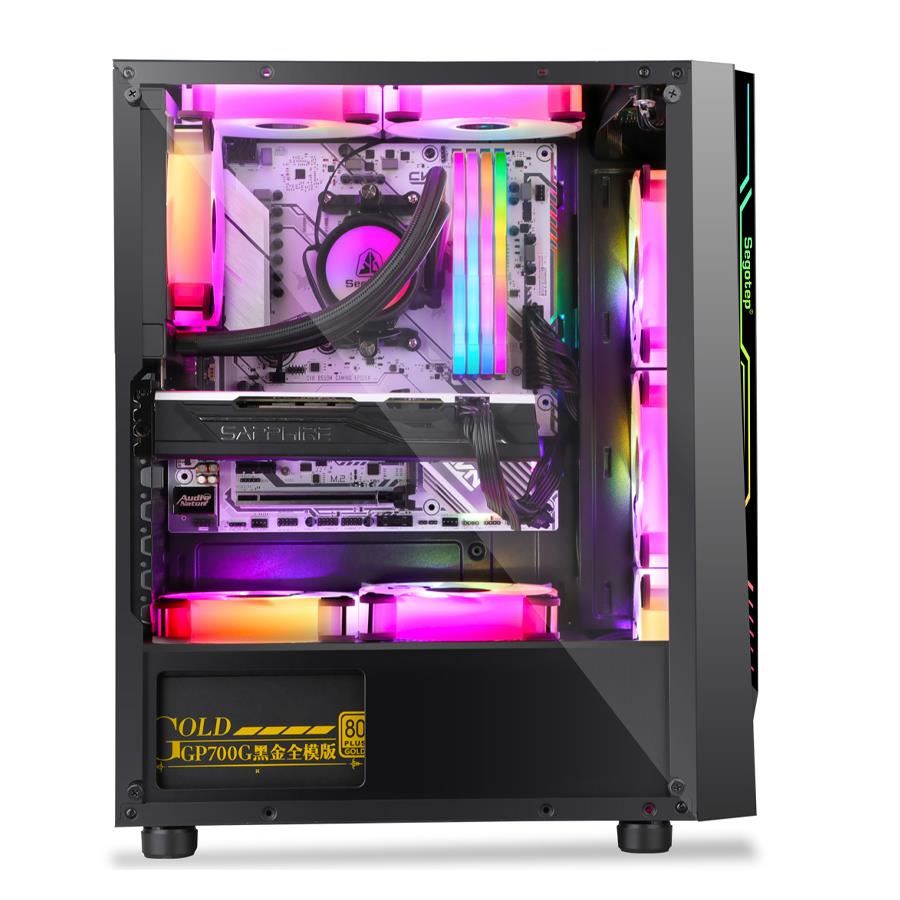 SPCC Steel ATX Mid Tower, fara sursa (tip ATX, montata jos), interior vopsit negru, 1x 3.5" (intern), 1x 2.5”/3.5" (intern), 1x 2.5" (intern), fata – 3x 120mm fans (optional), spate - 1x 120mm RGB fan (inclus), tavan – 2x 120mm (optional), design premium cu panou lateral din sticla securizata, panou frontal iluminat RGB