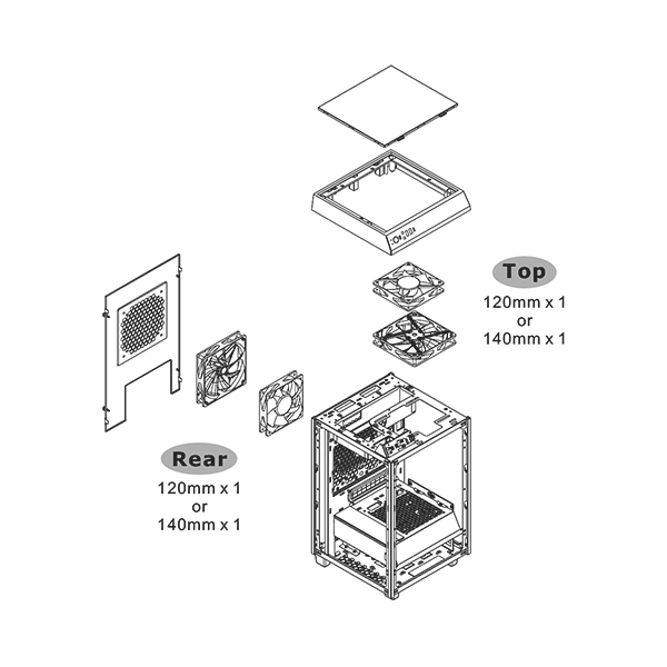 Ventilatoare: spate – 1x 120mm fan (Turbo fan 1000rpm, 16 dBA, inlcus) / 1x 140mm fans (optional), tavan – 1x 120mm fan (Turbo fans 1000rpm, 16dBA, inclus) sau 1x 140mm (optional), power cover – 1x 120/140mm (optional)