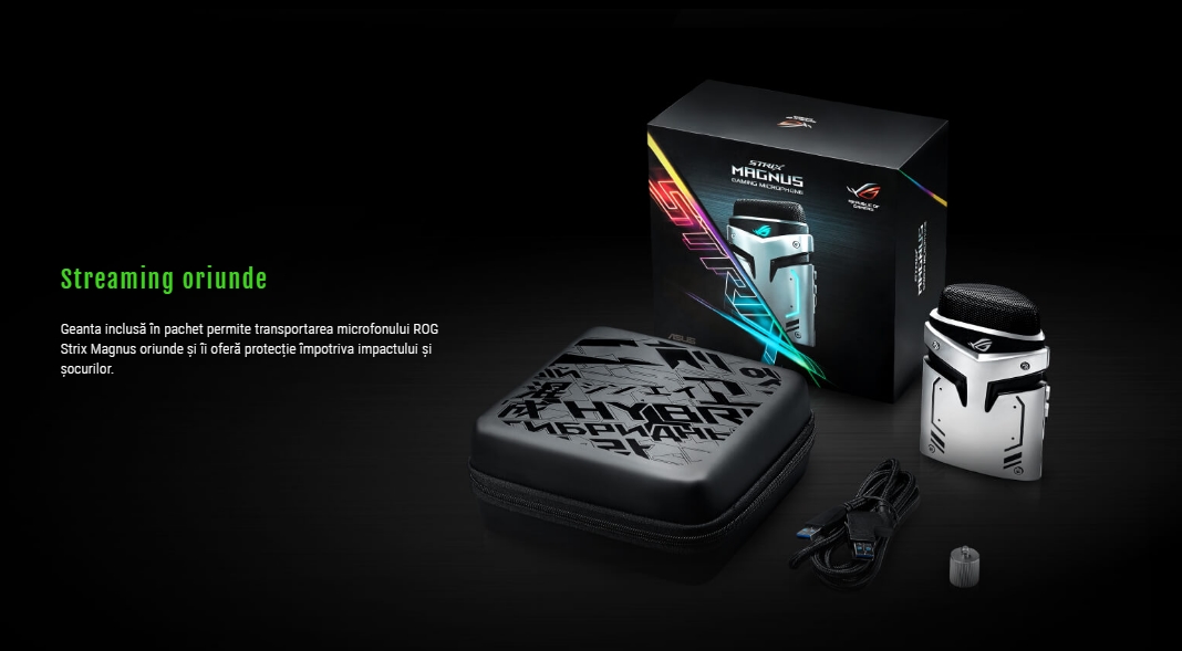 ROG Strix Magnus este primul microfon conceput special pentru pasionații de jocuri care creează conținut. El este prevăzut cu trei capsule de condensator cu calitate de studio pentru o calitate perfectă a înregistrării, tehnologie de eliminare a zgomotului ambiental (ENC), un design compact și soluție de iluminare AURA RGB. Prin toate acestea ROG Strix Magnus surclasează microfoanele tradiționale și te ajută să oferi audienței conținut la cea mai bună calitate.