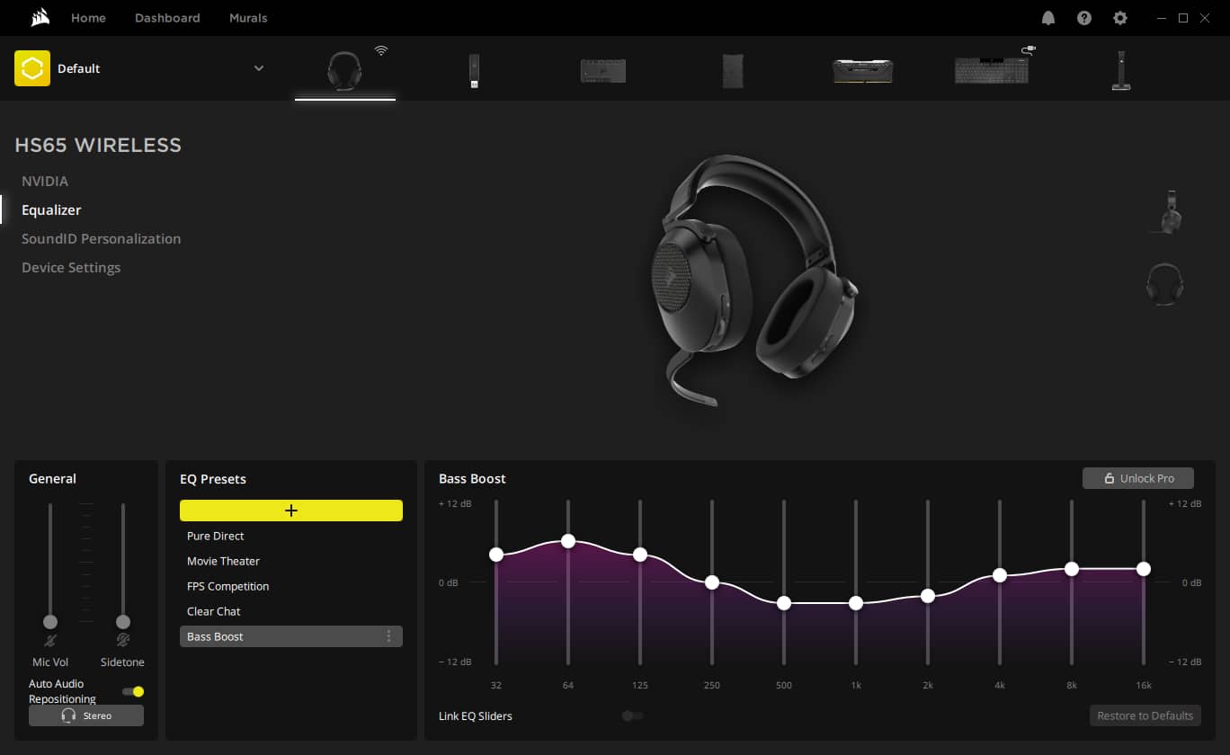 Obtineti cea mai buna experienta de ascultare in jocuri si muzica pe HS65 WIRELESS cu SoundID de la Sonarworks. Integrat in CORSAIR iCUE, SoundID personalizeaza profilul audio al castilor pentru a se potrivi preferintelor dvs. auditive unice. Nu mai trebuie sa va incurcati cu cursoare complexe - pur si simplu faceti un test rapid de preferinte pentru a va crea profilul sonor perfect.
