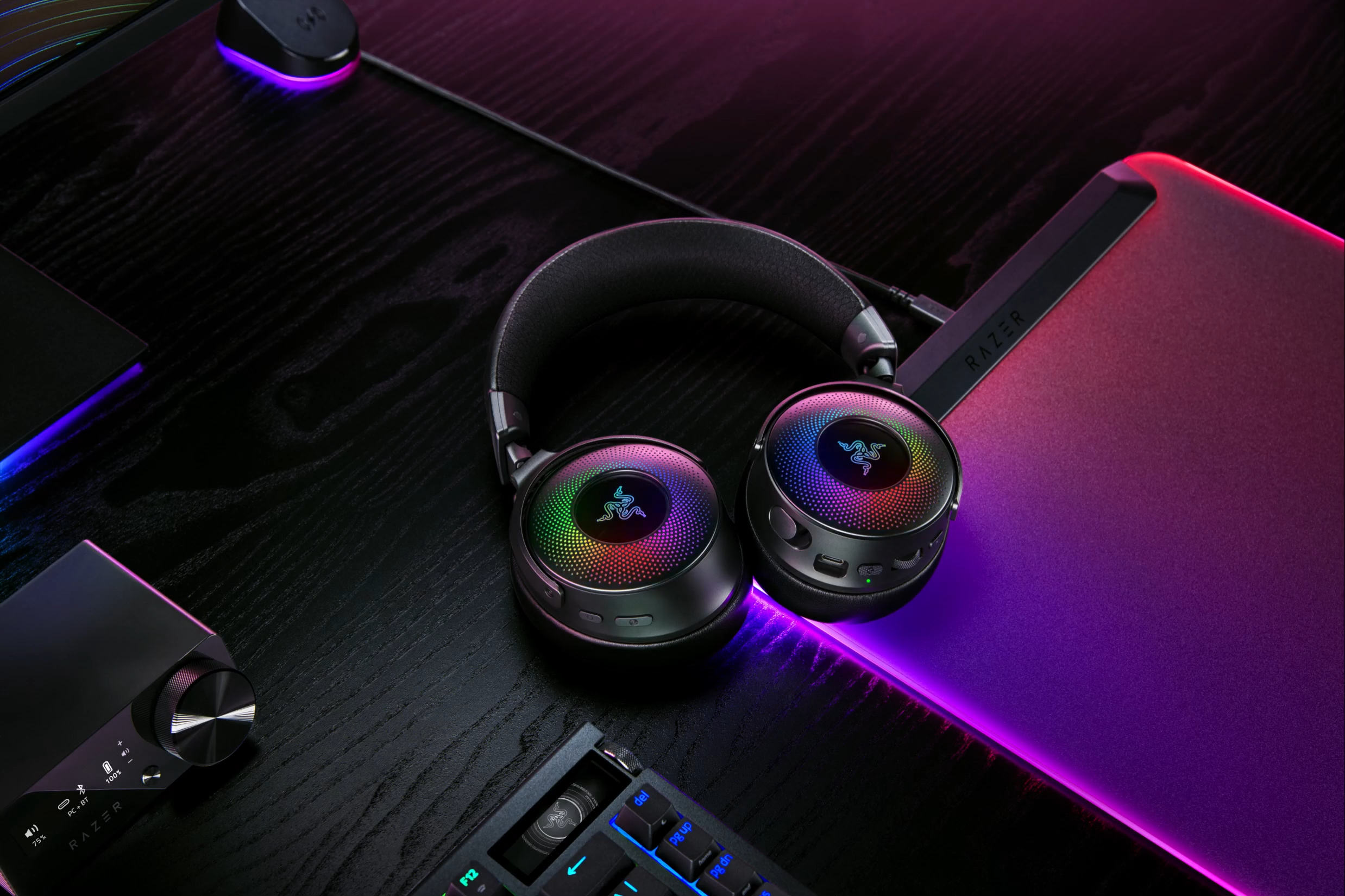 Descrierea produsului Casti Gaming Razer Kraken V4 Pro Wireless, Bluetooth, THX Spatial Audio, Chroma RGB, Microfon retractabil HyperClear, OLED Control Hub (Negru)