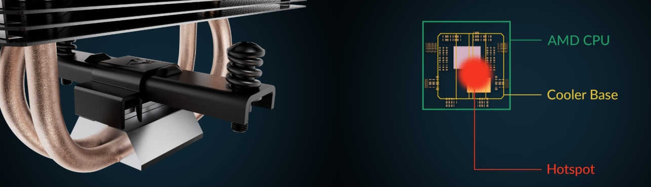 Permite montarea offset a heatsink-ului spre hotspot-ul CPU, optimizand alinierea pentru CPU-uri multi-die asimetrice si asigurand un transfer de caldura mai eficient.