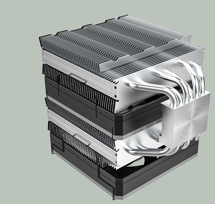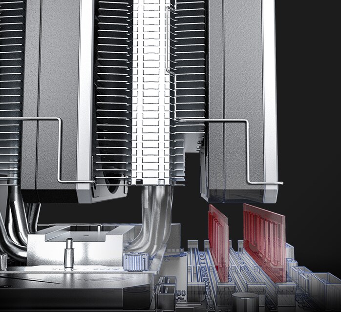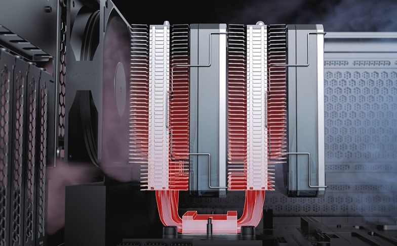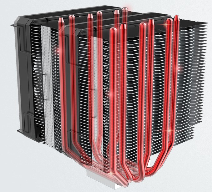 Sase conducte de caldura si design cu turn dublu In comparatie cu turnurile unice, racitoarele cu turn dublu ofera o suprafata si mai mare de disipare a caldurii. METAL DT24 BASE utilizeaza sase conducte de caldura avansate de cupru de 6 mm si le combina cu un design specializat de aripioare pentru o capacitate mai buna de transfer de caldura. Sistemul dublu ventilator ofera, de asemenea, un flux de aer crescut pentru o eficienta maxima de racire. |