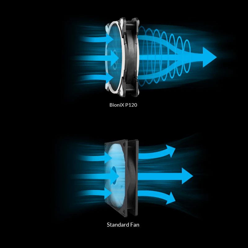 OPTIMIZAT PENTRU PRESIUNEA STATICA In timpul dezvoltarii noului BioniX P120, s-a pus un accent deosebit pe un flux de aer concentrat si, astfel, pe o presiune statica ridicata. Ventilatorul garanteaza o racire extrem de eficienta, chiar si cu o rezistenta crescuta a aerului. Prin urmare, BioniX P120 este potrivit in special pentru utilizarea pe radiatoare si heatsink. | ![]() |