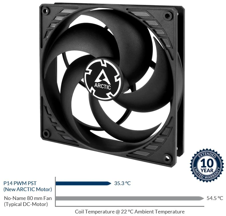 DURATA DE VIATA PRELUNGITA O temperatura a motorului mai mica cu 10 °C dubleaza aproximativ durata de viata a ventilatorului. Noul motor ARCTIC are o durata de viata de patru ori mai mare prin temperatura sa scazuta a bobinei. | ![]() |