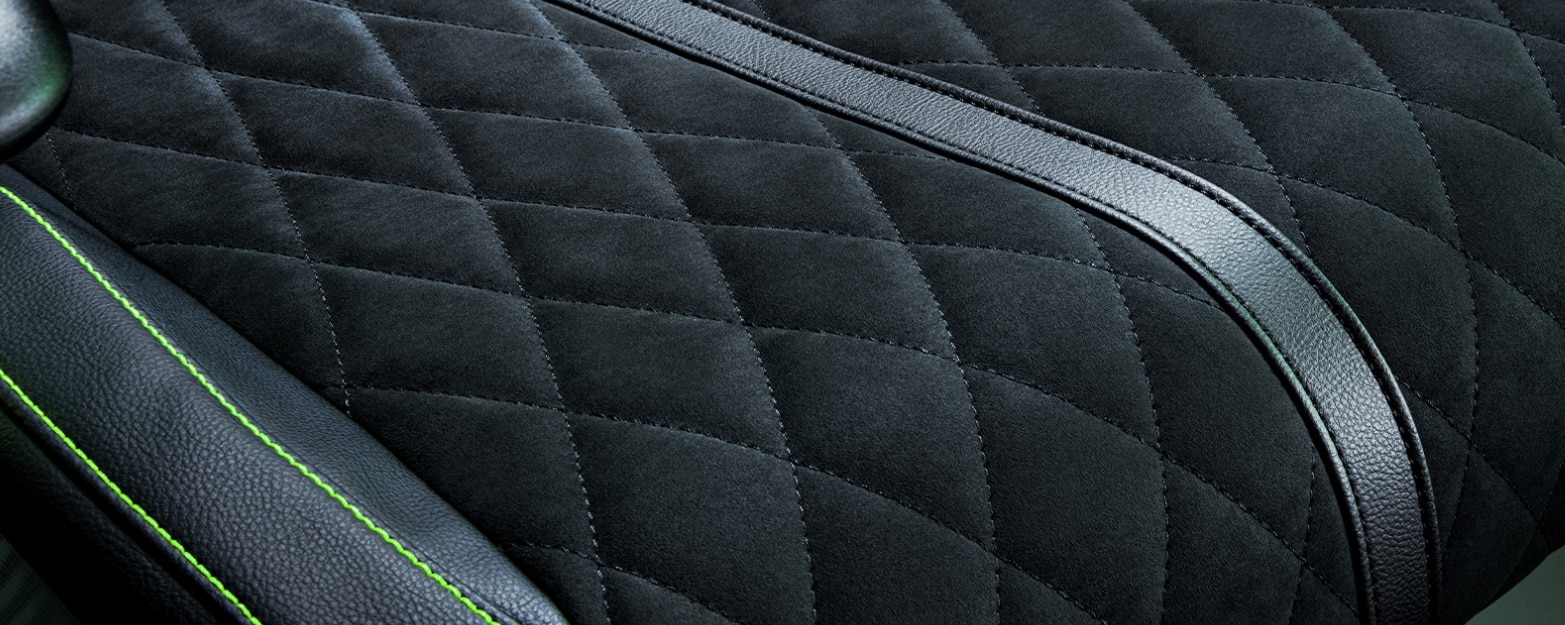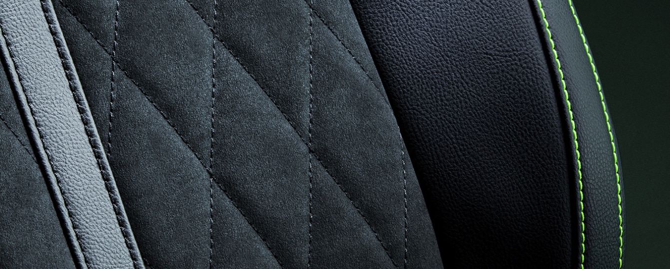 TAPITAT CU ALCANTARA®. Finisajul sau unic cu textura dubla realizeaza combinatia potrivita de confort si durabilitate - cu material Alcantara plusat si moale la atingere pe spatar si la baza scaunului pentru o senzatie de calitate superioara, iar marginile exterioare sunt captusite cu imitatie de piele neteda si durabila pentru a rezista mai bine la uzura zilnica. | ![]() |