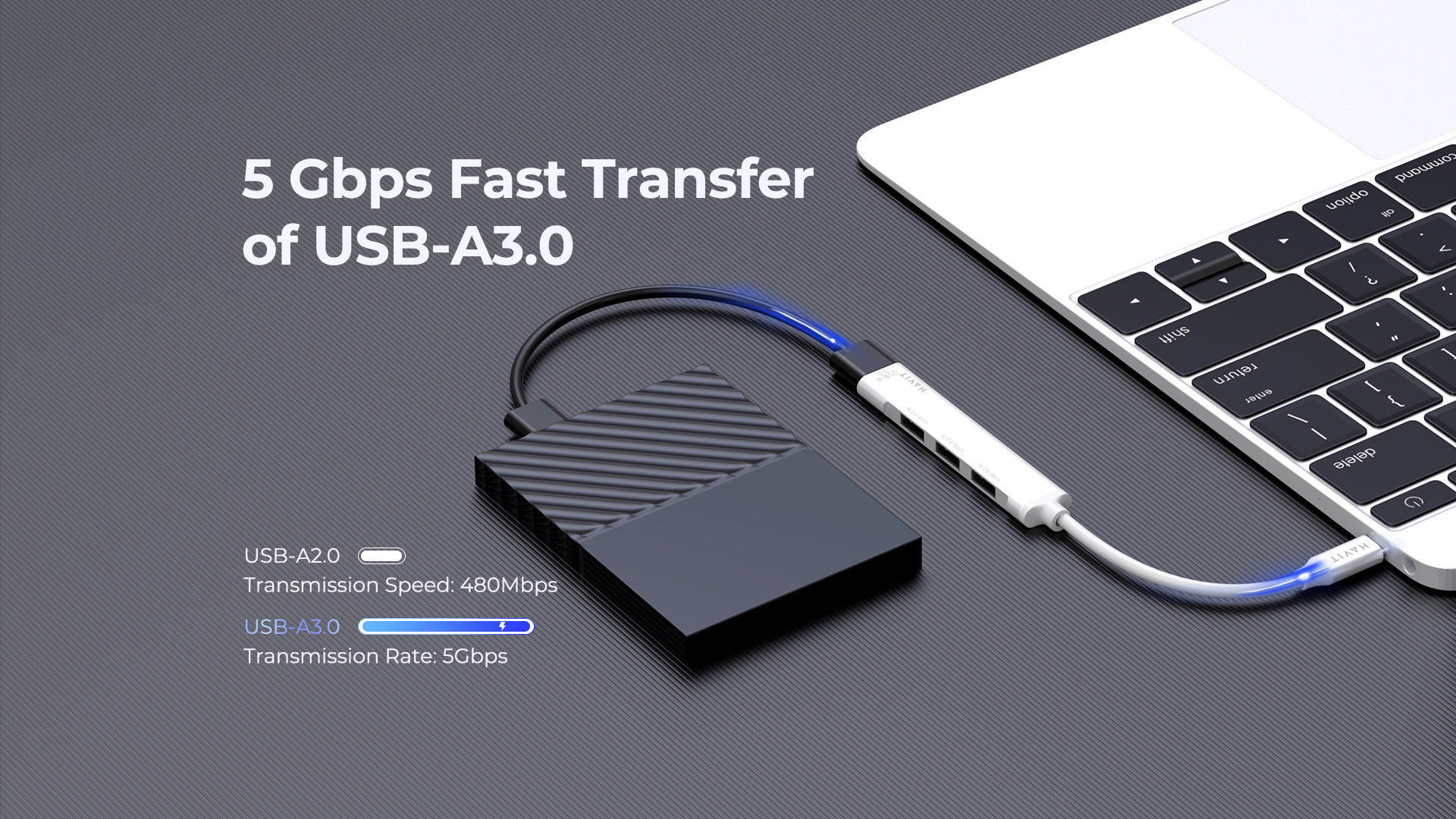 Dispozitivul ofera 4 porturi USB-A, care functioneaza la standardul USB 3.0 si 2.0, permitand viteze de transfer de pana la 5 Gbps. Astfel, fisierele mari precum filme, imagini de inalta rezolutie sau proiecte de lucru pot fi transferate rapid si fara intarzieri. Aceasta viteza ridicata il face potrivit nu doar pentru transferul de date, ci si pentru conectarea perifericelor precum mouse, tastatura, imprimanta sau stick USB. In acelasi timp, hub-ul poate gestiona mai multe dispozitive simultan, mentinand o performanta stabila.