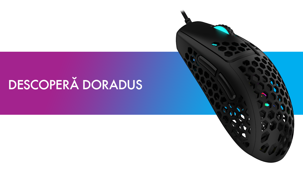 Purtând numele unei mici constelații vizibilă din emisfera sudică și înfațișând un peștișor de aur, mouse-ul DORADUS înglobează caracteristici de ultimă generație într-un pachet ergonomic și ultra-ușor dedicat gamerilor dreptaci, oferind precizie și confort remarcabil pentru a domina în jocurile favorite.