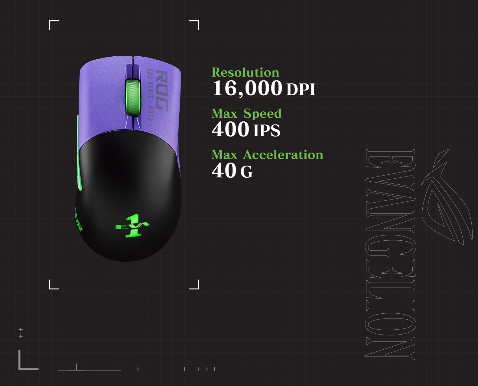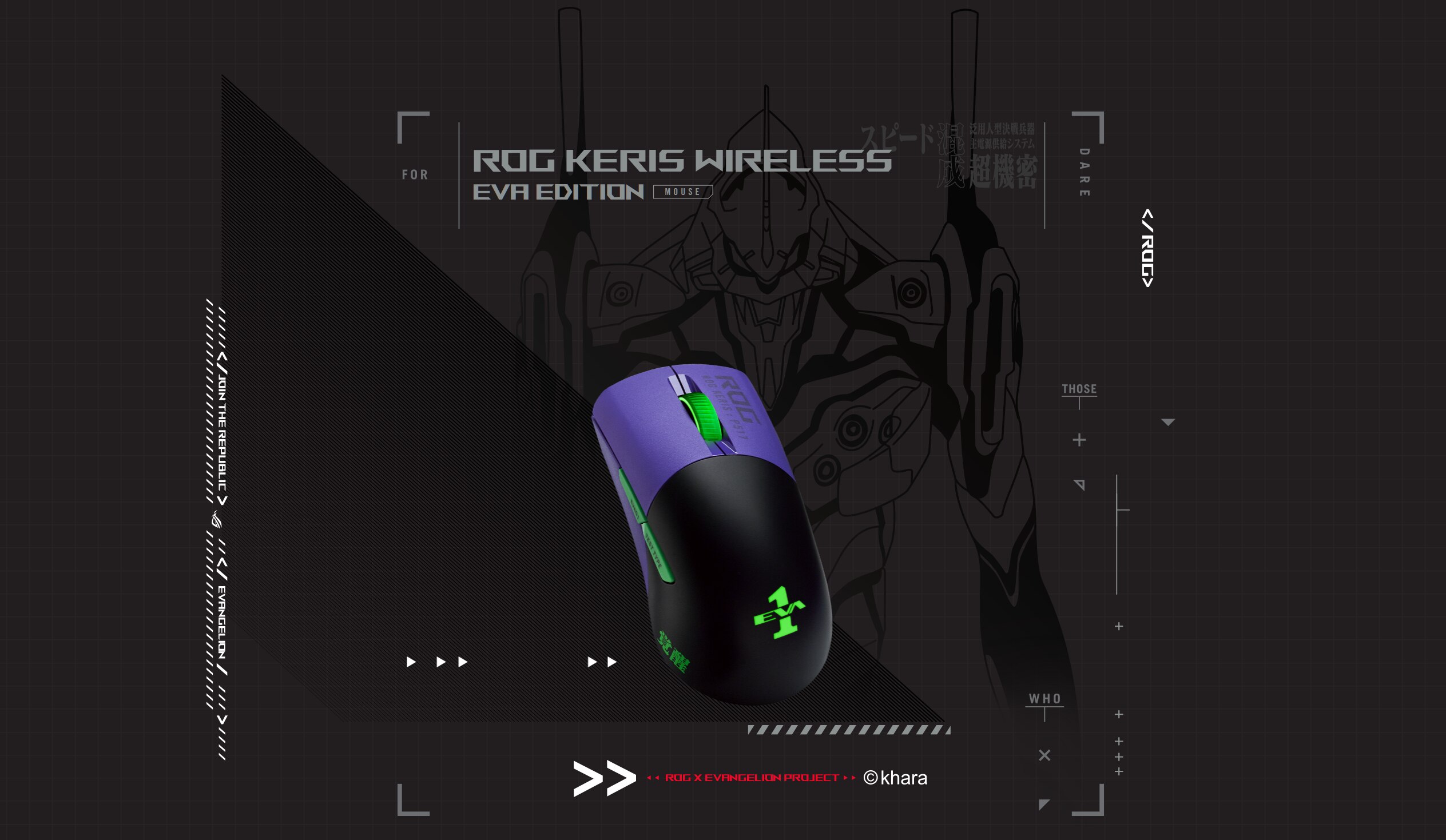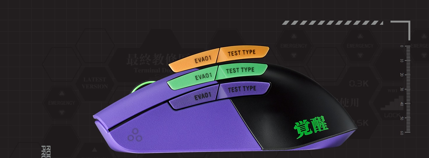 Suntem in anul 2022. Republica Gamerilor lanseaza un nou echipament pentru proiectul EVANGELION. ROG Keris Wireless EVA Edition cantareste doar 79 de grame si poarta schema de culori verde si violet izbitoare a lui EVA-01. Cu un senzor ROG de 16.000 dpi si mufe de comutator ROG push-fit, utilizatorii pot tinti cu o precizie extrema si pot personaliza cantitatea de forta de declansare necesara pentru a livra o incarcatura amenintatoare.