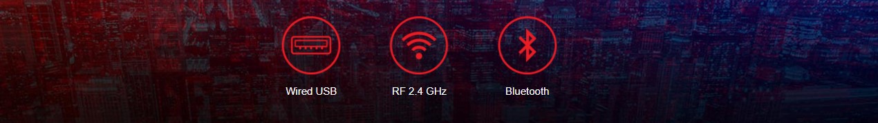 ROG Keris Wireless poate fi conectat într-un unul dintre cele trei moduri disponibile — prin conexiune radio ultra-rapidă în banda de 2,4 GHz, prin Bluetooth® LE eficient energetic sau prin cablu USB. Poți folosi conexiunea wireless în banda de 2,4 GHz pentru gaming și poți trece pe Bluetooth LE pentru sarcinile de rutină zilnice.