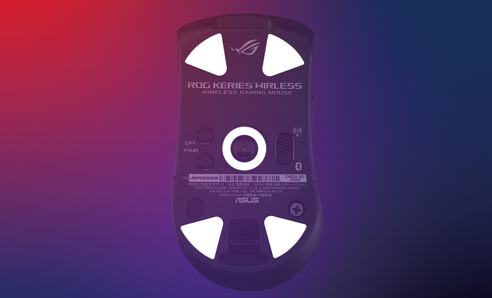 După o serie de teste, echipa de designeri ROG a determinat faptul că piciorușele mouse-ului și direcționalitatea afectează alunecarea mai mult decât dimensiunile. Piciorușele mouse-ului fabricate 100 % din teflon (PTFE) sunt rotunjite și cu 25 % mai fine decât cele ale altor mouse-uri de gaming, pentru a asigura o alunecare fără efort pe orice suprafață.