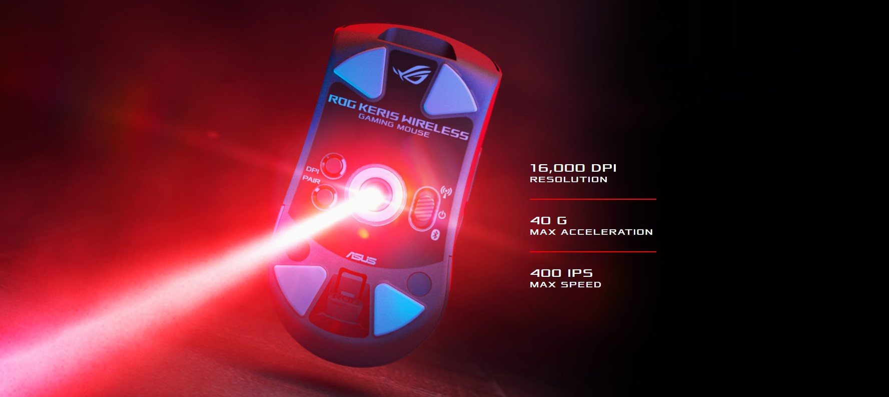 ROG Keris Wireless este un mouse de gaming ușor, de 79 de grame, destinat jocurilor FPS, cu conectivitate tri-mod — cablu, radio 2,4 GHz sau Bluetooth® LE — și un senzor special tunat ROG 16.000 DPI. Este echipat, de asemenea, cu socluri exclusive push-fit pentru comutatoarele ROG Micro Switch, butoane stânga și dreapta din polimer PBT, butoane laterale schimbabile, piciorușe pentru mouse ROG Omni, ROG Paracord și iluminare RGB Aura Sync.