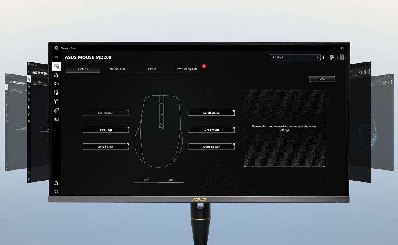ASUS SmartO Mouse Silent Plus include software-ul intuitiv Armoury Crate, care iti permite sa personalizezi modul in care functioneaza si sa monitorizezi statisticile vitale, cum ar fi durata de viata a bateriei, DPI si rata de interogare. Cu sase butoane personalizabile, puteti configura ASUS SmartO Mouse Silent Plus pentru a va maximiza fluxul de lucru si puteti efectua cu usurinta ajustari ale preciziei de urmarire si ale ratei de polling in pagina de functii a software-ului.