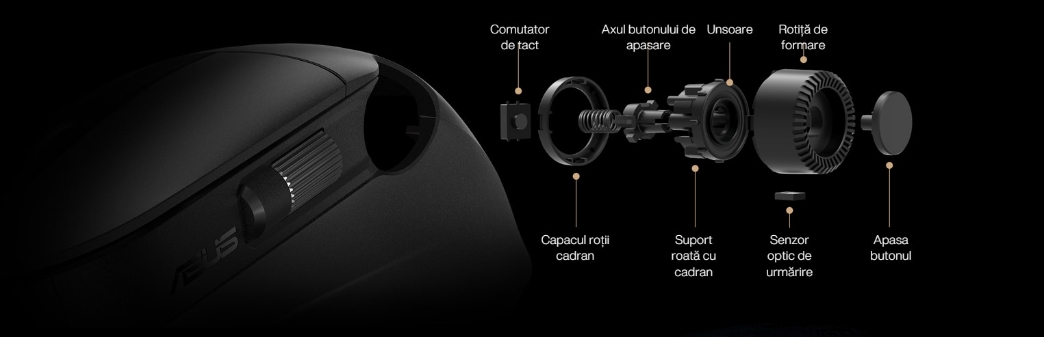 ASUS Dial de pe ProArt Mouse MD300 este cel mai bun din clasa sa si are componente de calitate. Stratul de grasime din suportul rotii cu cadran asigura o defilare lina si stabila, oferind o experienta impecabila pentru utilizator.