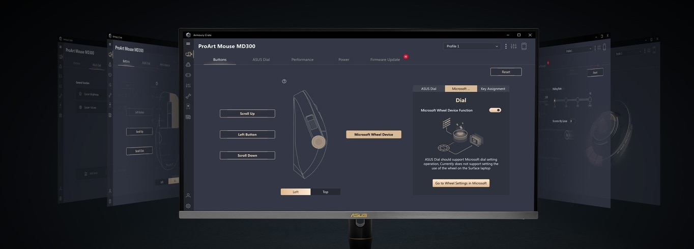 O interfata de utilizare intuitiva va permite sa reglati usor ProArt Mouse MD300 pentru a se potrivi nevoilor dvs. creative. Reglati setarile de performanta si personalizati comenzile pentru ASUS Dial, sase butoane programabile si doua derulari.