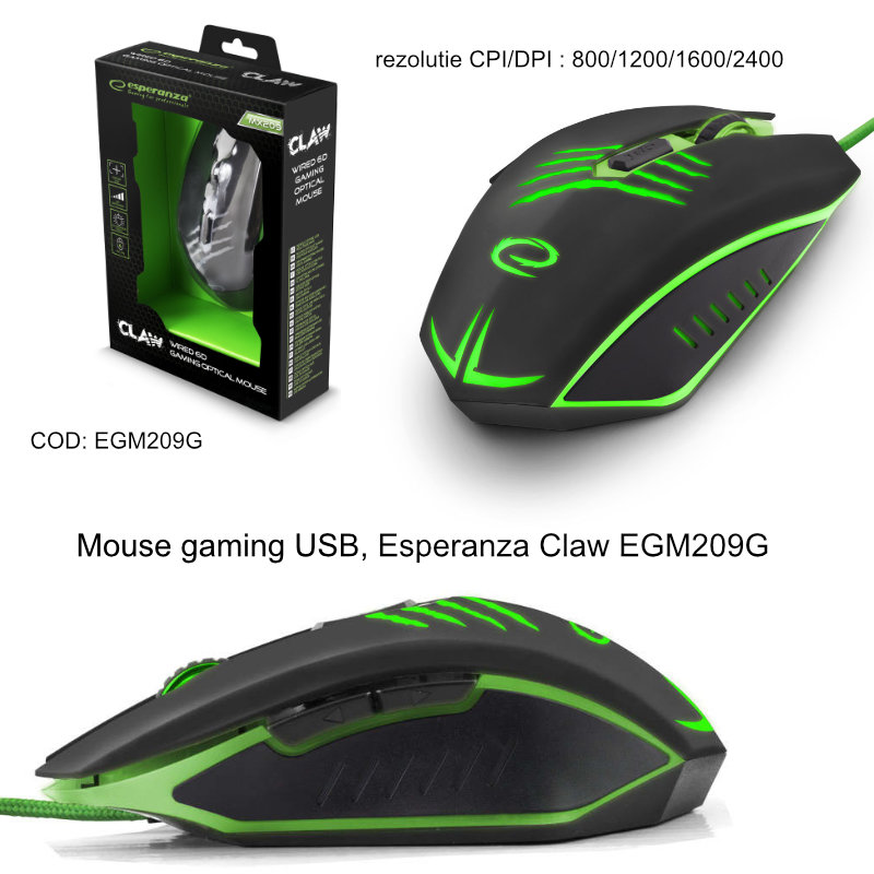 Descrierea produsului Mouse gaming USB, Esperanza Claw EGM209G, cablu 1.5m, 6D, Led verde, 800/1200/1600/2400 dpi