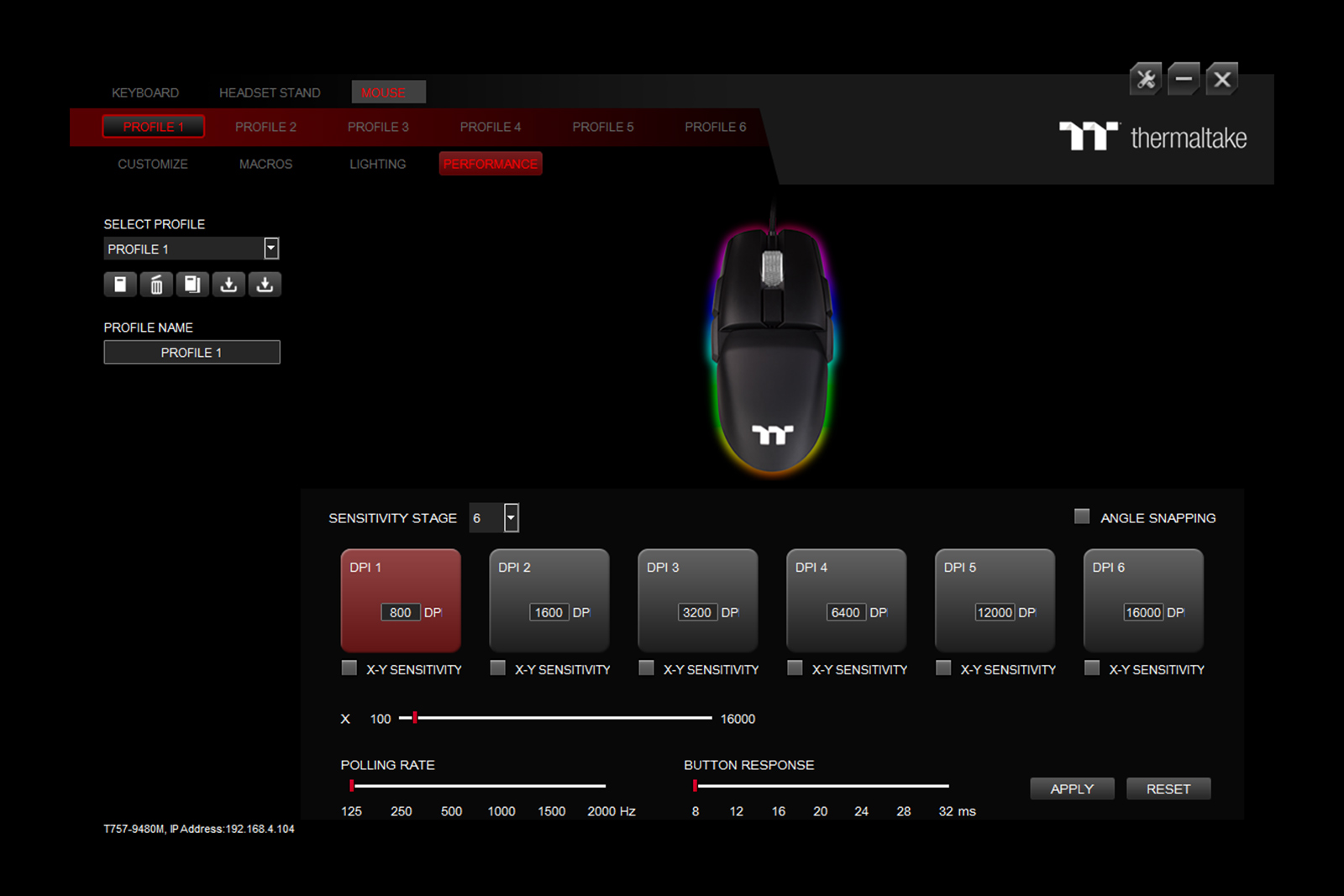 Mouse gaming Thermaltake Premium Argent M5 iluminare RGB negru, 16000 DPI (800, 1200, 1600, 3200, 6400, 16000 DPI), iluminare LED RGB (16.8 milioane de culori) cu diverse efecte de iluminare, senzor optic PIXART PMW-3389, 400 IPS, acceleratie: 50G, polling rate: 2000Mhz, numar butoane: 8 (programabile), micro switch-uri Omron (durata de viata: 50 milioane click-uri), design ergonomic, procesor ARM 32bit cu 64kb memorie interna, 6 profile, 48 macro-uri, software pentru configurare iTAKE ENGINE, compatibil cu TT RGB PLUS si RAZER CHROMA, lungime cablu: 1.8m, picioare de teflon, conector USB placat cu aur, lungime cablu: 1.8m, dimensiuni: 128 X 64 X 37mm, greutate: 97.9g (doar mouse-ul)