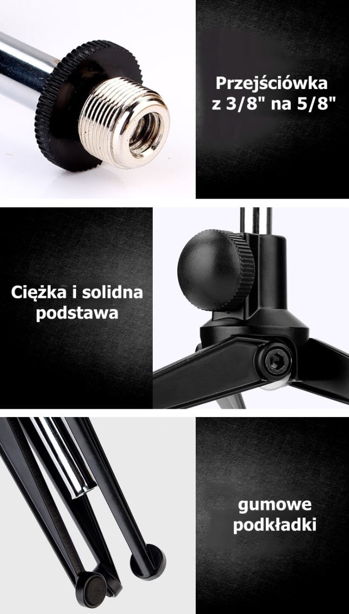Setul include un adaptor filet pentru microfon de la 3/8" la 5/8". Datorita acestuia, suntem siguri ca vom putea atasa oricand suportul pentru microfon indiferent de firul pe care il are.