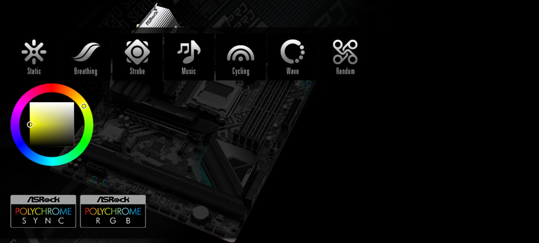 In plus fata de iluminarea RGB incorporata, dispune de asemenea de headers RGB onboard si de un header RGB adresabil care permit conectarea placii de baza la dispozitive LED compatibile, cum ar fi benzi, ventilatoare CPU, racitoare, sasiuri si asa mai departe. Utilizatorii pot, de asemenea, sa sincronizeze dispozitivele LED RGB prin intermediul accesoriilor certificate Polychrome RGB Sync pentru a crea propriile efecte de iluminare unice.