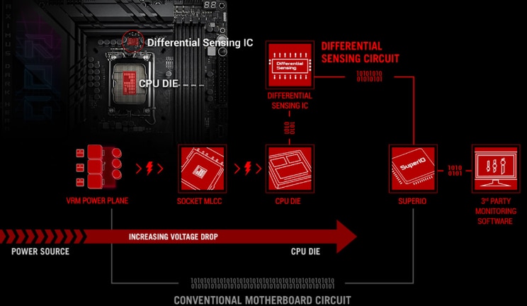 DETECTIE DIFERENTIALA Placile de baza conventionale folosesc detectarea cu un singur capat de linie, cu o locatie care nu este ideala, ceea ce duce la o diferenta mare intre tensiunea reala furnizata la CPU si valoarea raportata la software. ROG Maximus Z790 Dark Hero de la ROG Maximus Z790 dispune de un circuit de detectie diferentiala si de un circuit integrat delicat care simplifica overclocking-ul si tuning-ul, permitandu-va sa urmariti tensiunile cu mai multa acuratete. |