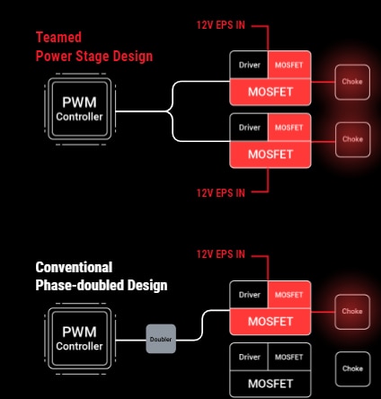 Performanta termica Fiecare componenta VRM are un scop specific. Controller-ele PWM si dublurile de faza controleaza circuitul, iar etajele de putere fac munca grea din punct de vedere electric si termic. Etapele de putere dispun de un RDSON scazut pentru a reduce pierderile de comutare si de conductie, contribuind la imbunatatirea marjei termice generale. |