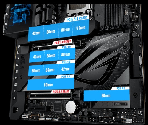 Cinci sloturi M.2 la bord ROG Maximus Z790 Dark Hero dispune de cinci sloturi M.2 la bord, dintre care unul este pregatit pentru PCIe 5.0 pentru a oferi viteze ametitoare de 16 GB/s, in timp ce celelalte ofera inca 8 GB/s prin interfete PCIe 4.0. Sloturi de expansiune Ambele sloturi de expansiune x16 au primit tratamentul PCIe 5.0 pentru a oferi viteze incredibile de pana la 64 GB/s pentru dispozitivele compatibile. Pentru a suporta greutatea placilor grafice masive, acestea sunt, de asemenea, protejate cu suporturi de retentie SafeSlot, iar slotul superior poate fi eliberat cu usurinta datorita butonului PCIe Slot Q-Release. |