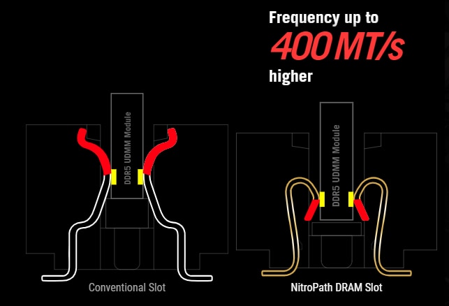 TEHNOLOGIA NITROPATH DRAM Tehnologia NitroPath DRAM ofera performante imbunatatite ale memoriei DDR5. Pinii cu degete de aur mai scurti si caile de semnal optimizate asigura transferuri de date mai rapide intre DRAM si CPU, permitand o mai mare stabilitate si o mai mare capacitate de overclocking a memoriei. Aceste sloturi DRAM reinformate sunt, de asemenea, mai bine pregatite pentru a rezista la uzura procesului de instalare a memoriei RAM decat modelele de sloturi traditionale, perfecte pentru entuziastii care isi mentin sistemul actualizat cu cele mai rapide kituri disponibile. |