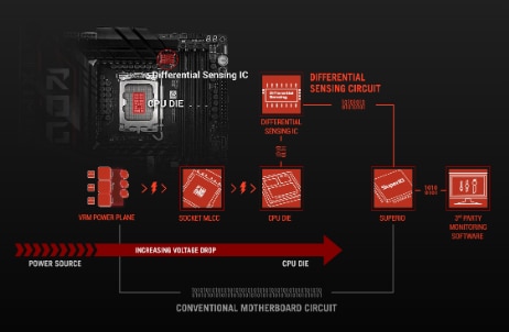 DETECTARE DIFERENTIALA Placile de baza conventionale utilizeaza detectia single-ended captata dintr-o locatie care nu este ideala, ceea ce duce la o disparitate mare intre tensiunea reala alimentata la CPU si valoarea raportata la software. ROG Maximus Z890 Hero dispune de un circuit de detectie diferentiala si de un IC delicat care simplifica overclocking-ul si reglajul, permitandu-va sa urmariti tensiunile mai precis. |