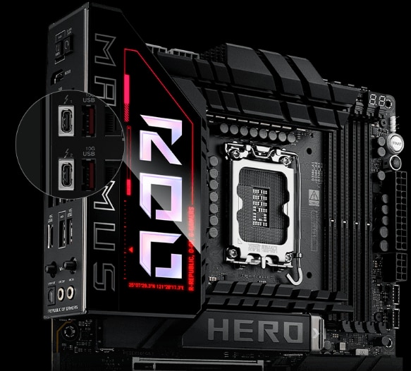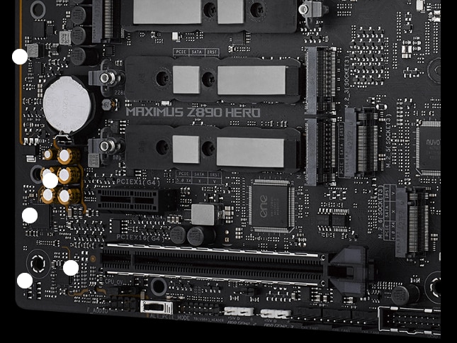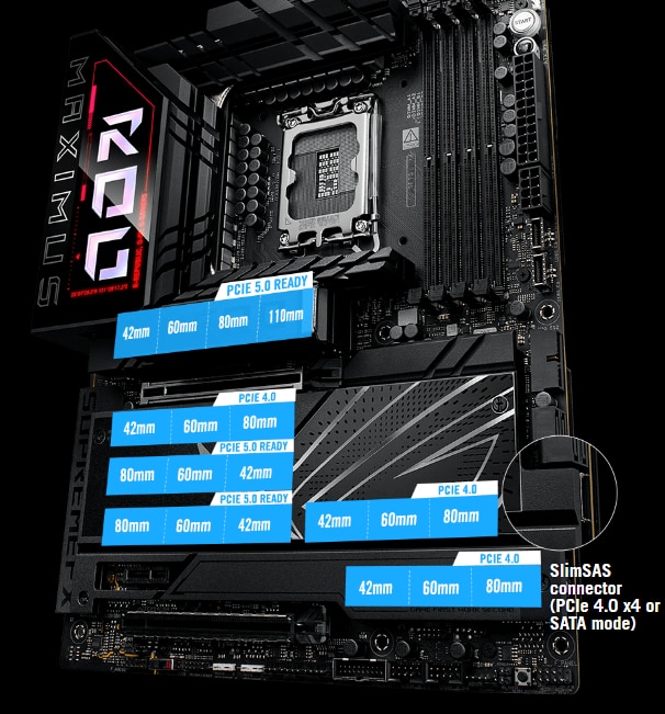 SASE SLOTURI M.2 INTEGRATE ROG Maximus Z890 Hero dispune de sase sloturi M.2 la bord, dintre care trei sunt pregatite pentru PCIe 5.0 pentru a oferi viteze ametitoare de 16 GB/s, in timp ce celelalte ofera inca impresionant 8 GB/s prin interfete PCIe 4.0. De asemenea, dispune de un conector SlimSAS, care accepta modul PCIe 4.0 x4 sau pana la 4 dispozitive SATA prin intermediul unui cablu de transfer. Cablul este achizitionat separat.
