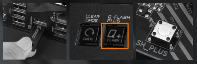 Actualizati cu usurinta BIOS-ul fara a instala procesorul, memoria si placa grafica. Cu GIGABYTE Q-Flash Plus, nu este nevoie sa instalati CPU, memoria si placa grafica si nici sa intrati in meniul BIOS pentru a actualiza BIOS-ul. Trebuie doar sa descarcati si sa salvati un nou fisier BIOS (redenumiti-l in gigabyte.bin) pe unitatea flash USB, apoi apasati butonul dedicat Q-Flash Plus si sunteti gata de plecare!