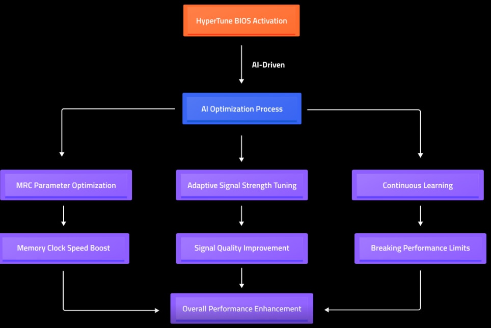 BIOS-ul HyperTune utilizeaza AI pentru a optimiza MRC si a se adapta semnalelor. Seria Z890 implementeaza acest lucru pentru eficienta maxima, permitand cresteri semnificative ale vitezei ceasului memoriei si performante generale imbunatatite.