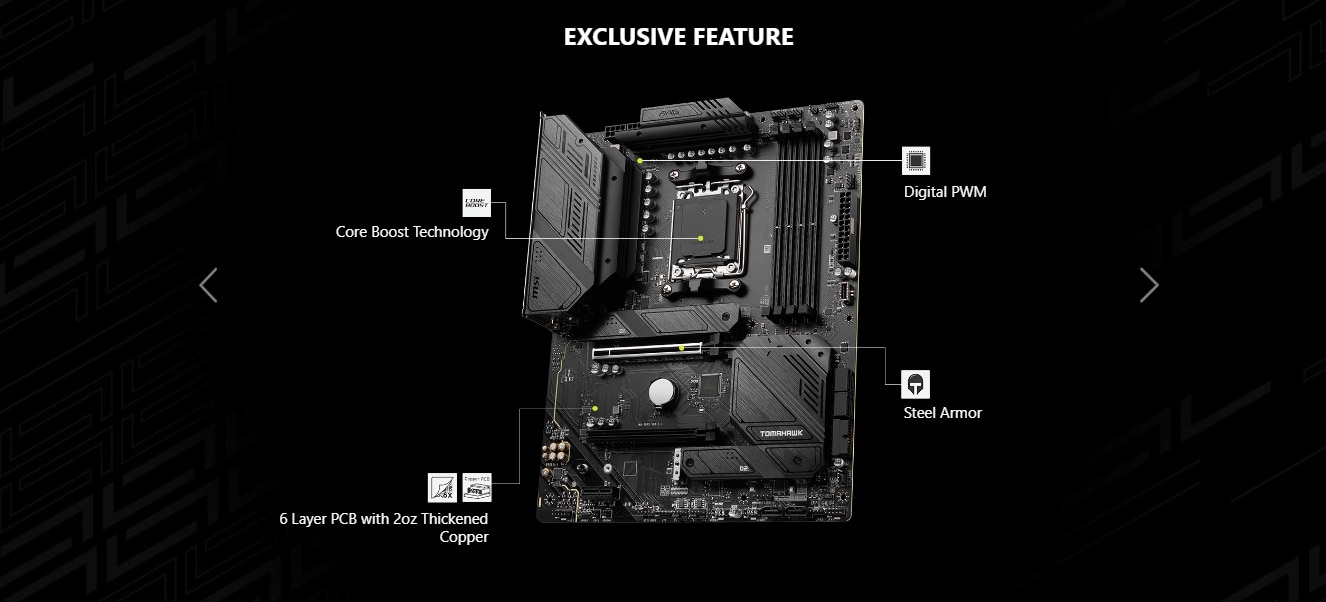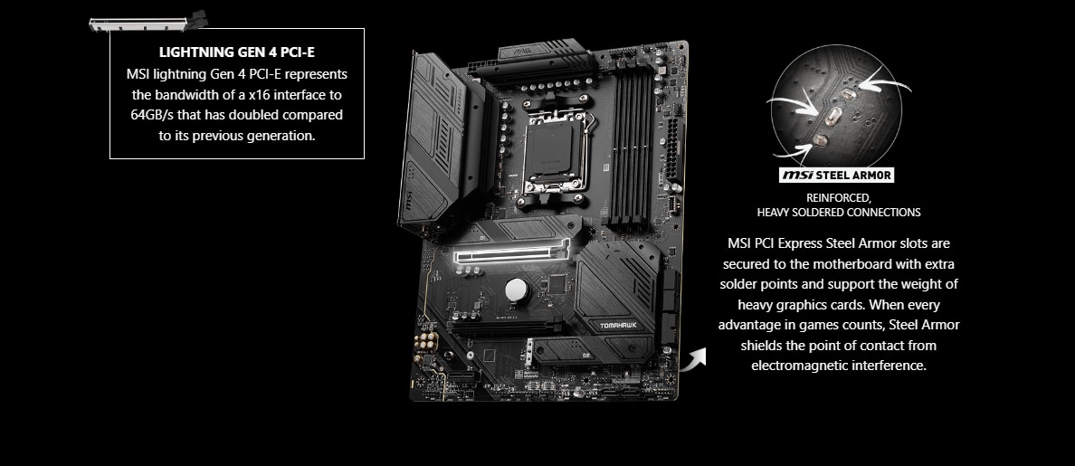 Sloturile MSI PCI Express Steel Armor sunt fixate pe placa de baza cu puncte de lipire suplimentare si suporta greutatea placilor grafice grele. Atunci cand fiecare avantaj in jocuri conteaza, Steel Armor protejeaza punctul de contact de interferentele electromagnetice.
